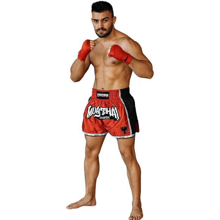 Kick-/Thaiboxing Shorts aus qualitativ hochwertigem edlem Satin. Hervorragende Verarbeitung (hand made). Rote Thai Hose mit Doppeladler Wappen und Schriftzug Albaniens. Mit breitem elastischen Bund und seitlichen Schlitzen für perfekten Tragekomfort. Schnürung in der Innenseite. Spezieller kurzer Schnitt für High-Kicks und Kniestösse.
