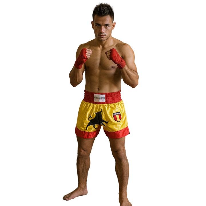 Kick-/Thaiboxing Shorts aus qualitativ hochwertigem edlem Satin. Hervorragende Verarbeitung (hand made). Rot / Gelbe Hose mit spanischem Wappen und schwarzem Stier.Mit breitem elastischen Bund und seitlichen Schlitzen für perfekten Tragekomfort. Schnürung in der Innenseite. Spezieller Schnitt für High-Kicks und Kniestösse.